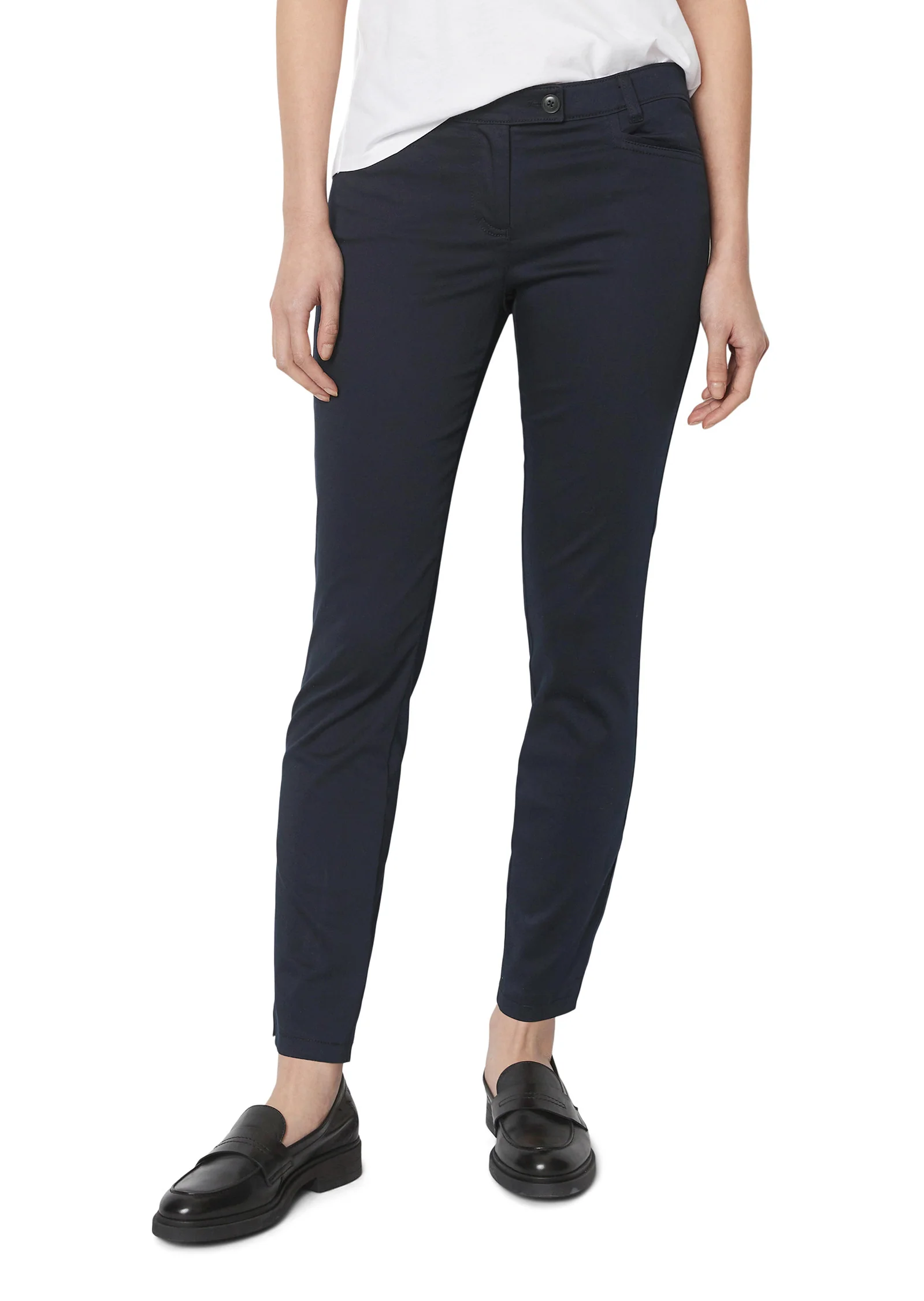 Subtil glänzend: Die Hose - Modell LAXÅ - in schmalem Slim Fit mit leicht verkürztem Bein und angenehm hoher Leibhöhe. Die Knöpfe kommen in edler Hornoptik, die Hosentaschen sind paspeliert. Der Bio-Baumwoll-Mix ist angenehm elastisch und hat eine wunderbar glatte, satiniert wirkende Oberfläche.